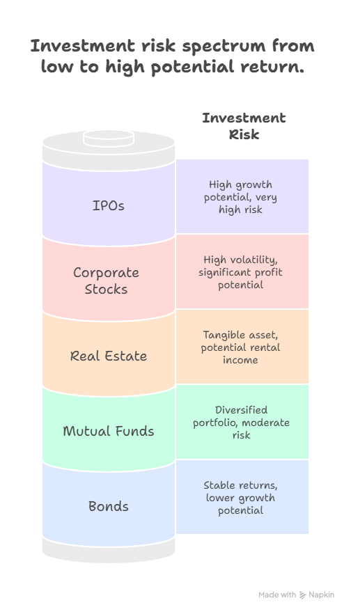 Investment in Initial Public Offers (IPO) offers investors an advantage to buy shares at face value as it’s going public for the first time. Low investment is required. Growth potential may be high as the company uses money for its growth and expansion, aiming for higher profitability.